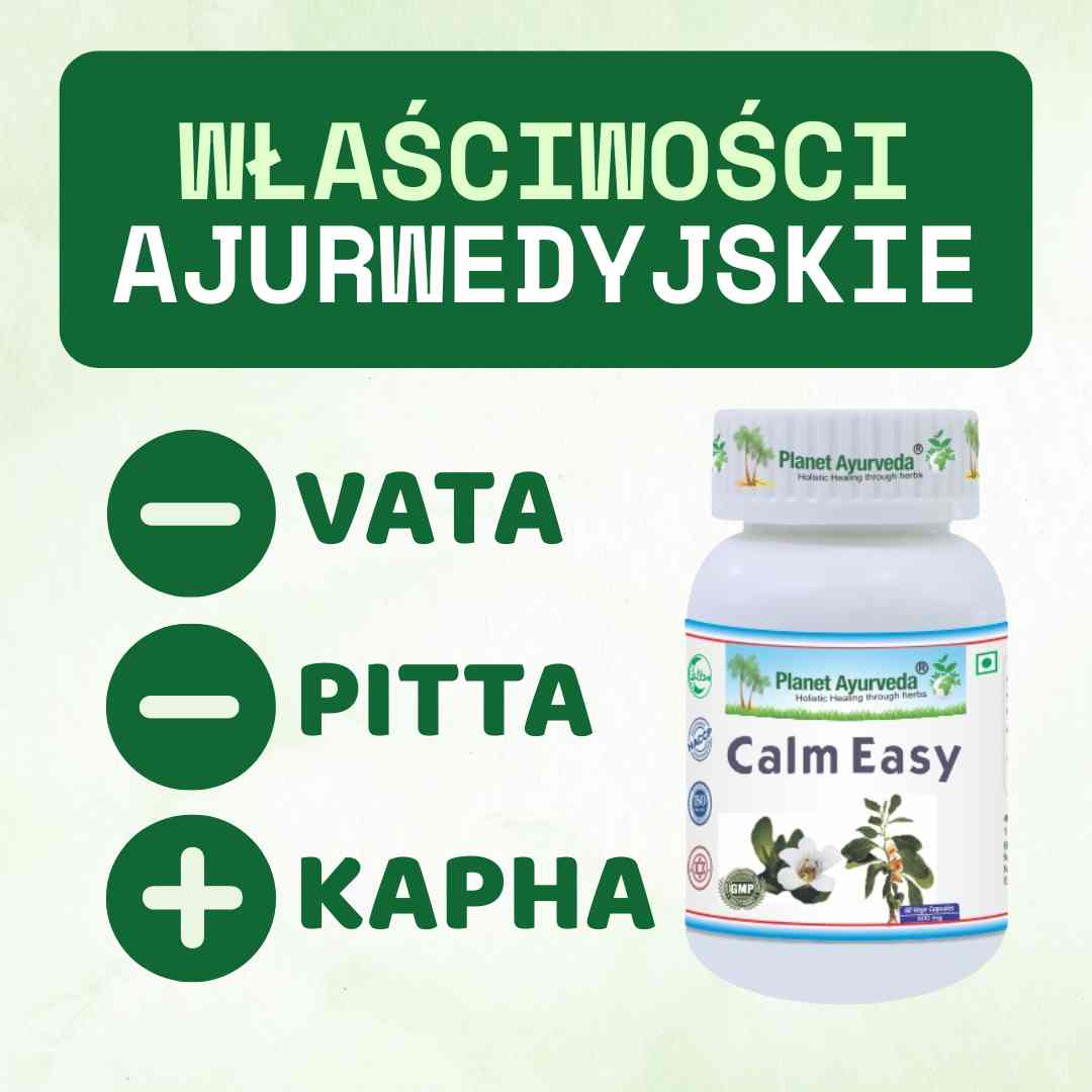Calm Easy to naturalny suplement ajurwedyjski, który wspiera relaks i równowagę emocjonalną. Zawiera ekstrakty roślinne, takie jak ashwagandha, które pomagają organizmowi radzić sobie ze stresem i przyczyniają się do dobrego snu.